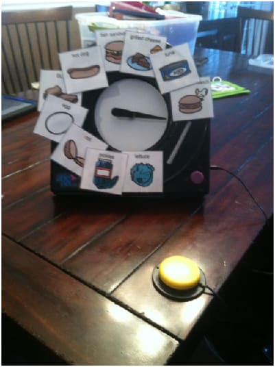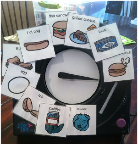I used the spinner to involve the students in a game of Bingo. This was a fun activity to target social skills, language, and participation. As you can see in the pictures, I attached Mayer-Johnson pictures of food around the spinner. Each player took a turn to be the Bingo caller by hitting the switch to spin the spinner. We would then look at their Bingo cards to see if they had a match. We have been working on nutrition units and learning about food groups but any vocabulary can be used for a Bingo game like this. If you want your student to be working on taking turns and participating, then make a Bingo game using things they love. These could be characters from Pixar movies or favorite TV shows. Bingo games take a bit of prep work to make up the cards and pictures, but the versatility of the activity is worth it.