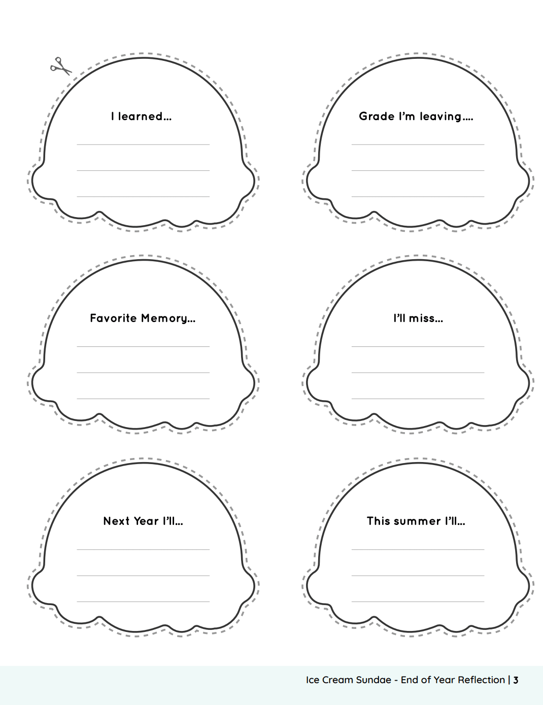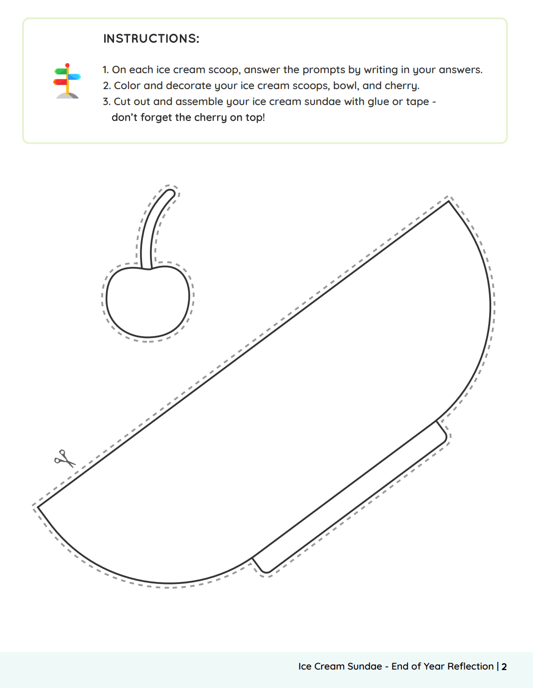 Your free PDF worksheet is our “End-of-Year Reflection- Ice Cream Sundae Activity” PDF! Download, print, and hand this activity out to your students to reflect on their school year and write down their thoughts and reflections during the class discussions.