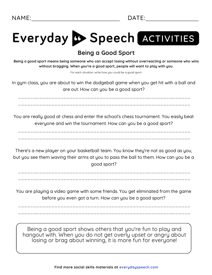 - Printable worksheet: Everyday Speech “Being a Good Sport”