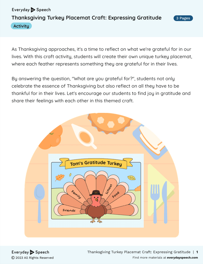 Sign up hereThanksgiving isn’t just about feasts and parades; it’s a time for reflection and gratitude. Special educators can bring this spirit into their classrooms with a fun and meaningful craft activity from Everyday Speech. Check out this this free elemententary Thanksgiving craft and lesson plan!