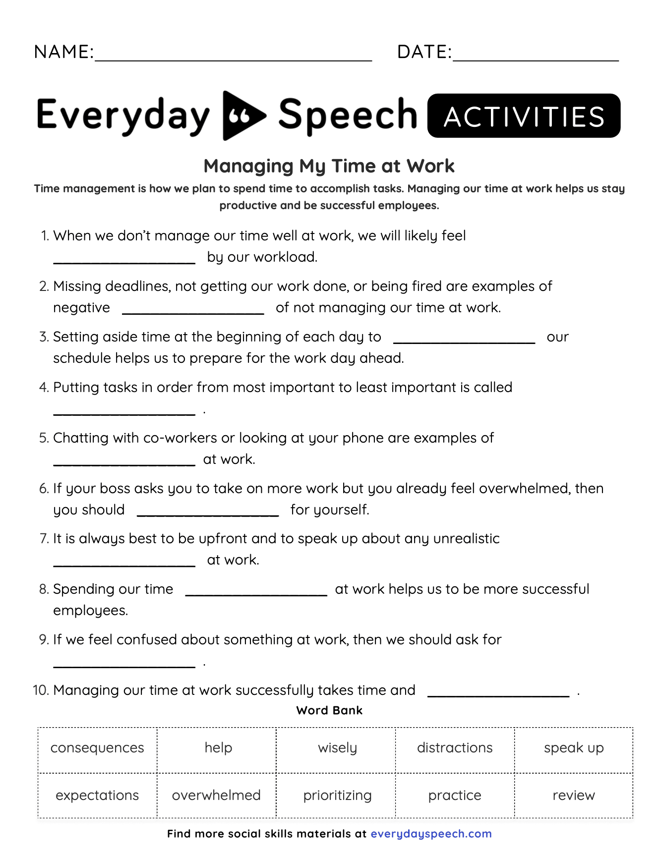 - Free Worksheet on Managing Time at Work PDF for each student.
