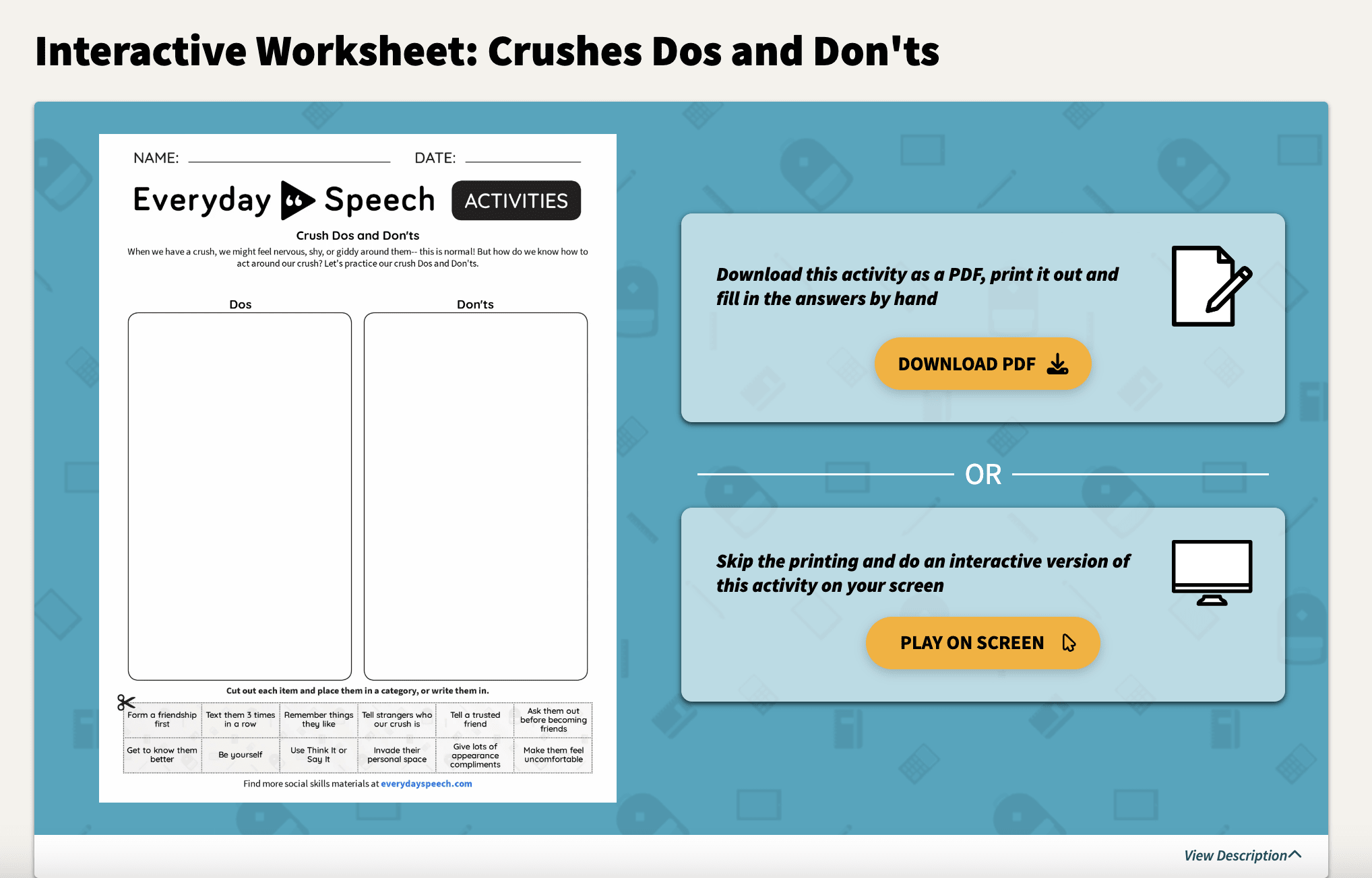 The interactive Dos and Don’ts worksheet from Everyday Speech is a valuable tool for teaching students how to manage their feelings when they have a crush. This activity involves sorting behaviors into two columns: dos and don’ts. It helps students identify appropriate and inappropriate actions, ensuring they handle their emotions and interactions responsibly.