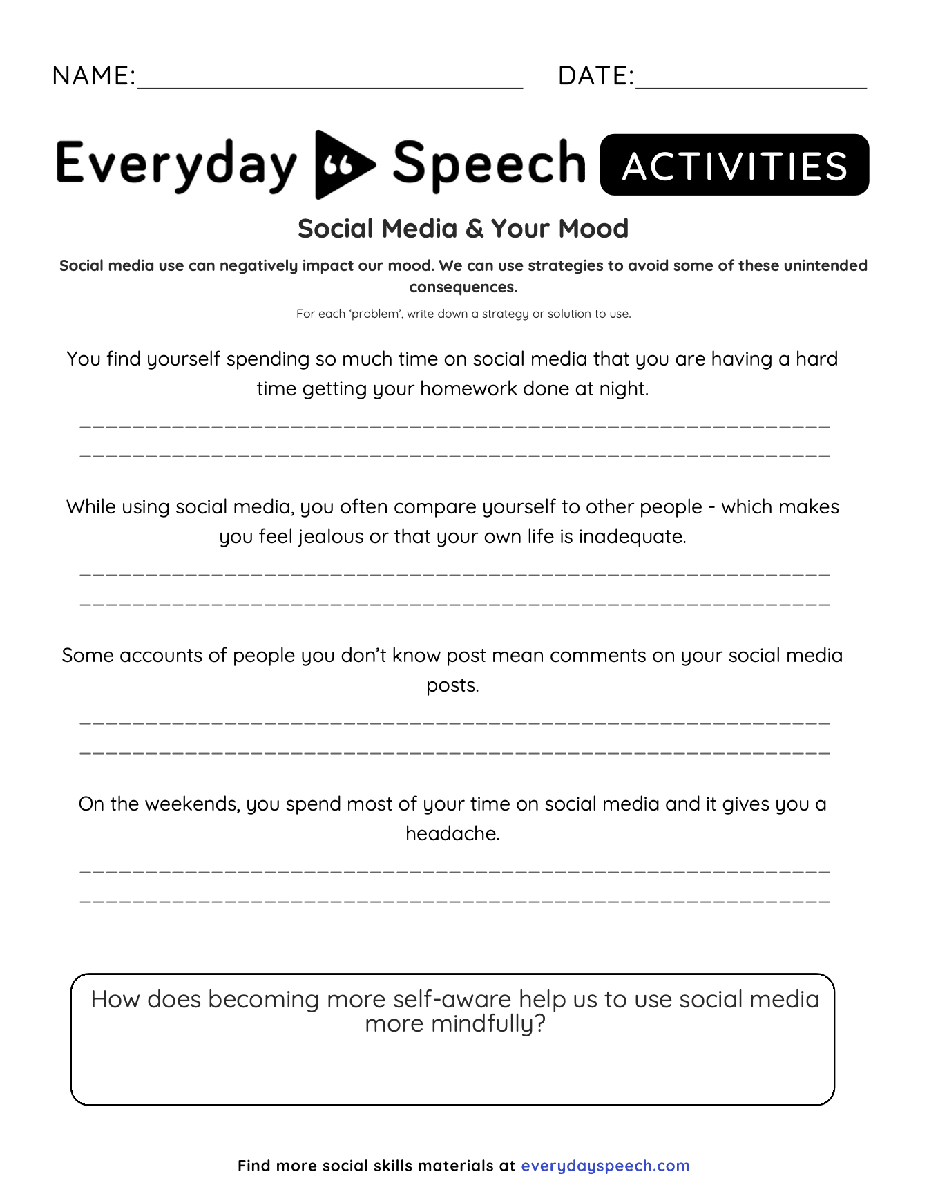 - Worksheet Activity (10-15 minutes): Distribute the “Social Media and Your Mood” worksheets. Have students work through various scenarios presented, discussing and documenting coping strategies for managing the emotional impact of social media.