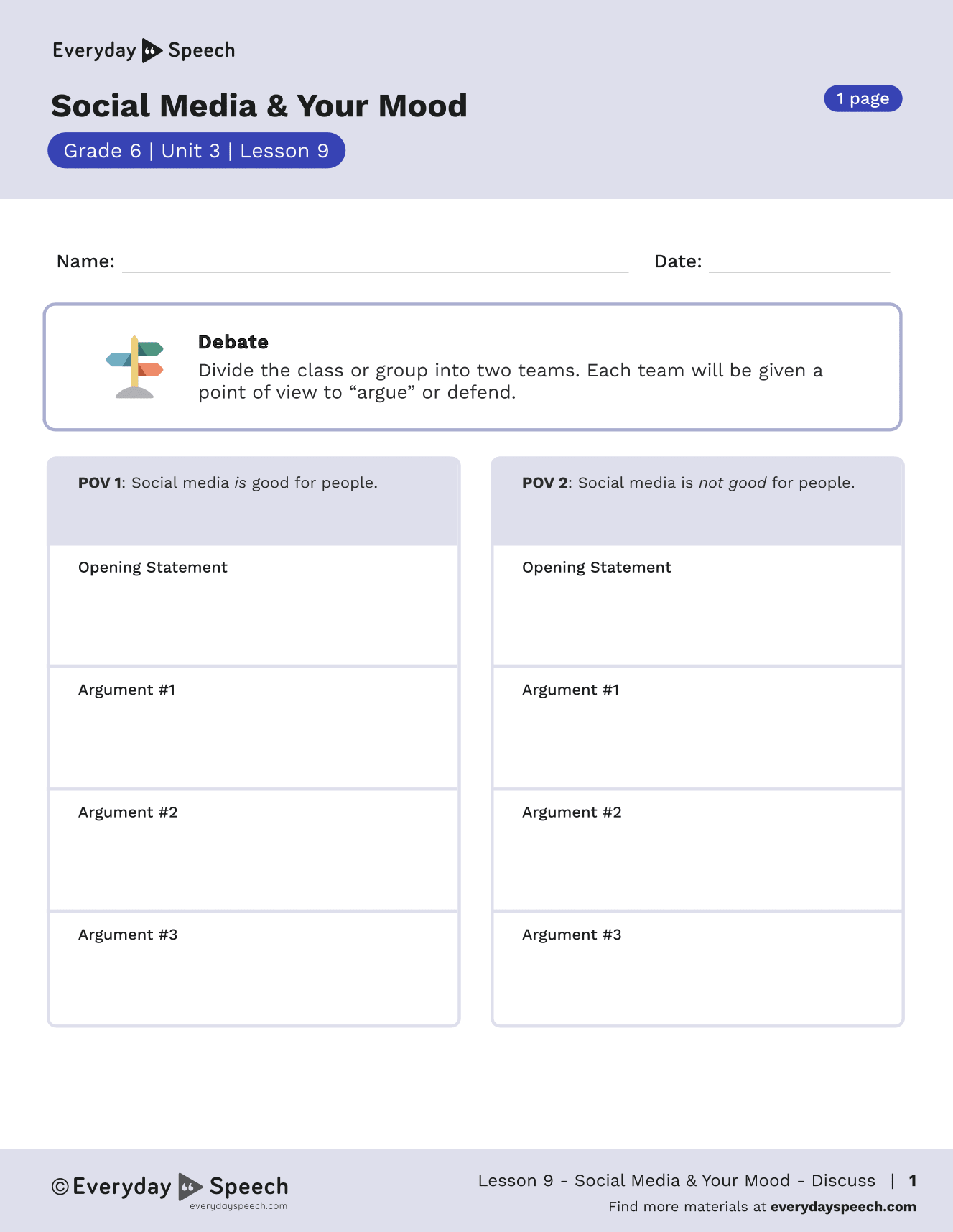 Materials: Access to the “Social Media and Your Mood” digital SEL video, debate prompts, “Social Media and Your Mood” worksheet.